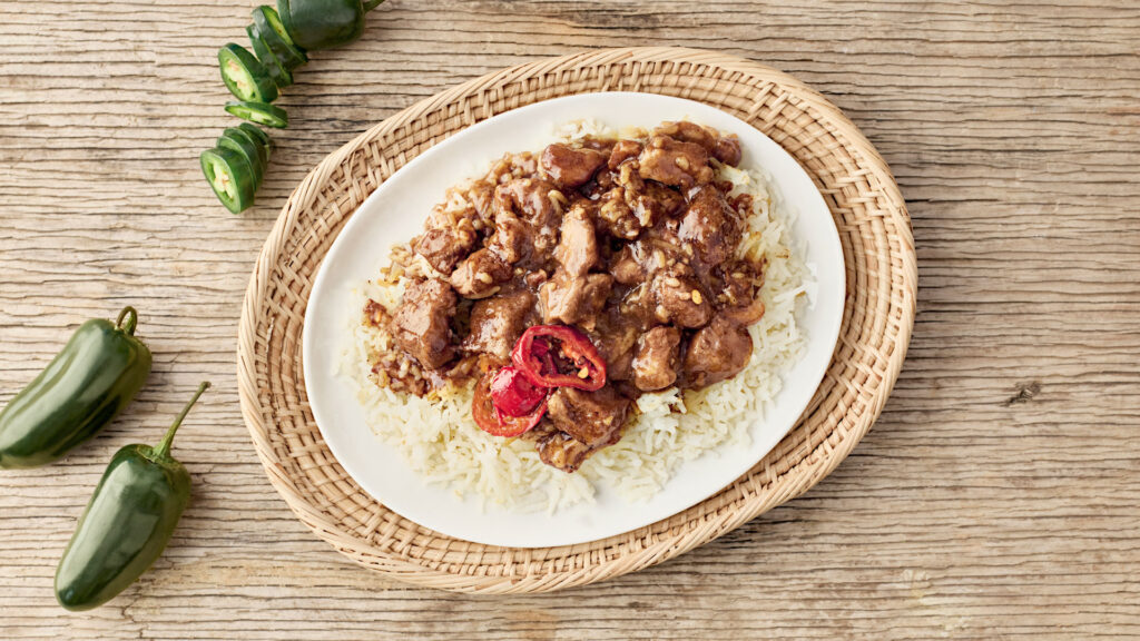 Pehmeän basmatiriisin päällä lepää hennosti chilillä viimeisteltyä possua, joka saa makunystyrät heräämään, mutta ei polta liikaa. Täydellinen yhdistelmä kotimaisuutta ja kaukomaiden mausteisuutta. Nam! 😋