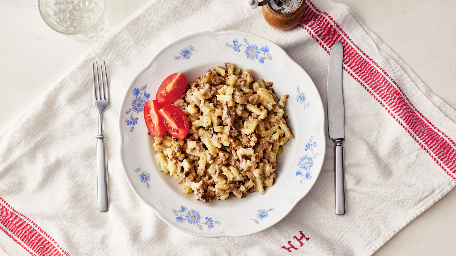 Tässä rehdissä peruskiusauksessa on kotimaista perunaa niin että maistuu. Lisäksi tietysti Snellmanin kotimaista jauhelihaa, joka ruskistetaan ennen uuniin laittoa. Maistuu koko perheelle – onneksi rasiasta riittää useammalle syöjälle.
