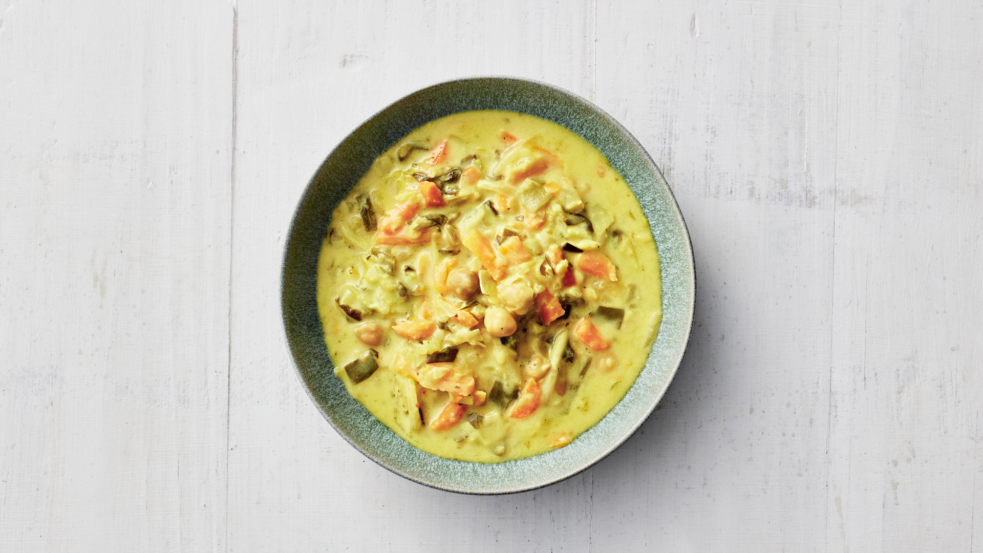 Vesi, kookoskerma 11 % (muu kuin EU) (kookosuute, vesi), porkkana, kikherne 8 % (muu kuin EU), sipuli, fenkoli, pinaatti, purjo, linssi, limepyre, valkosipuli, rapsiöljy, maissitärkkelys, jodioitu suola, inkivääri, sokeri, chili, sitruunanruoho, kurkuma, korianteri, limelehti. Kasviksia 45 % tuotteesta.