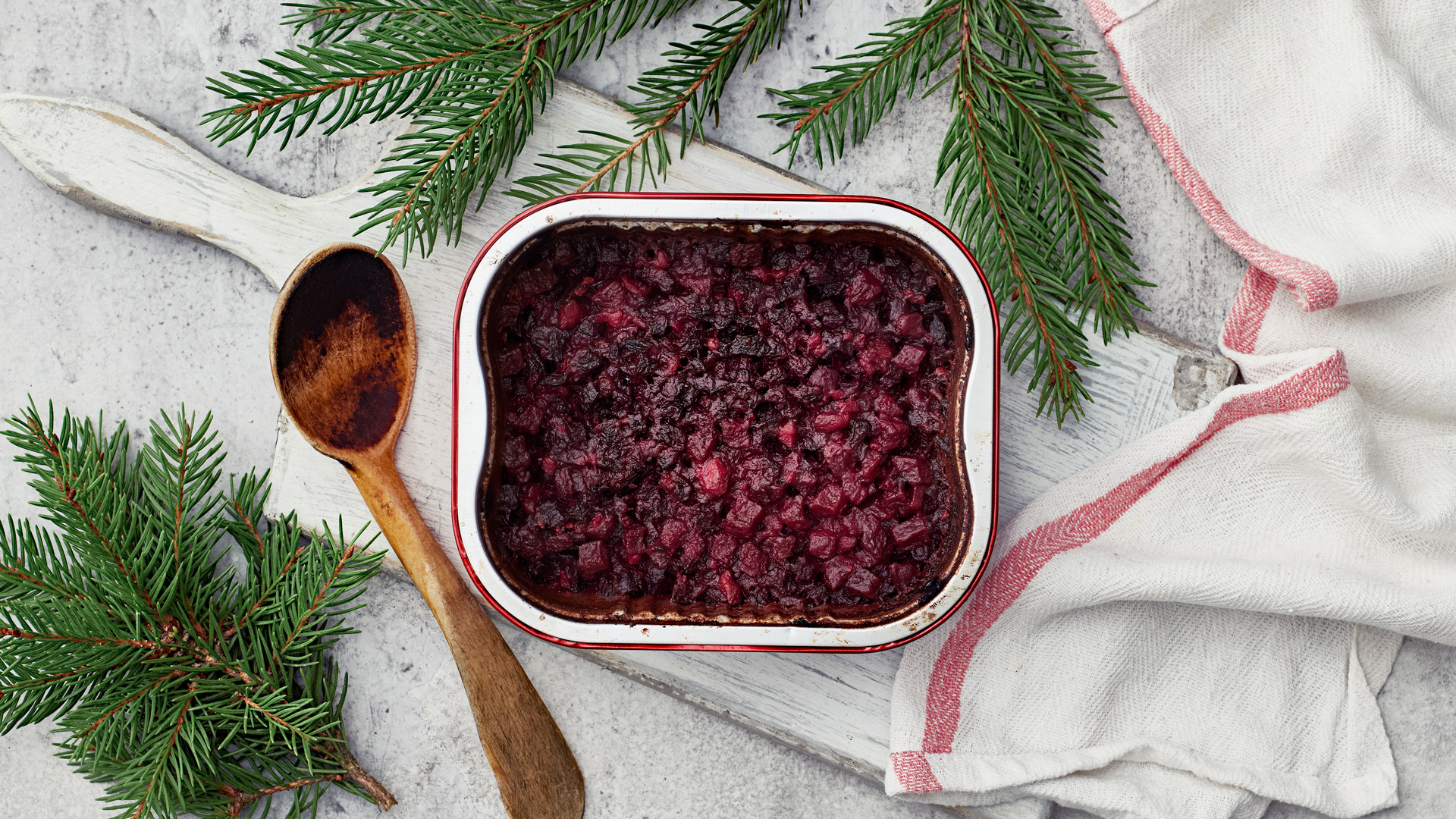 Punajuuresta ja omenasta valmistettu, Valio® AURA®sinihomejuustolla aateloitu lisäys joulun juhlapöytään.