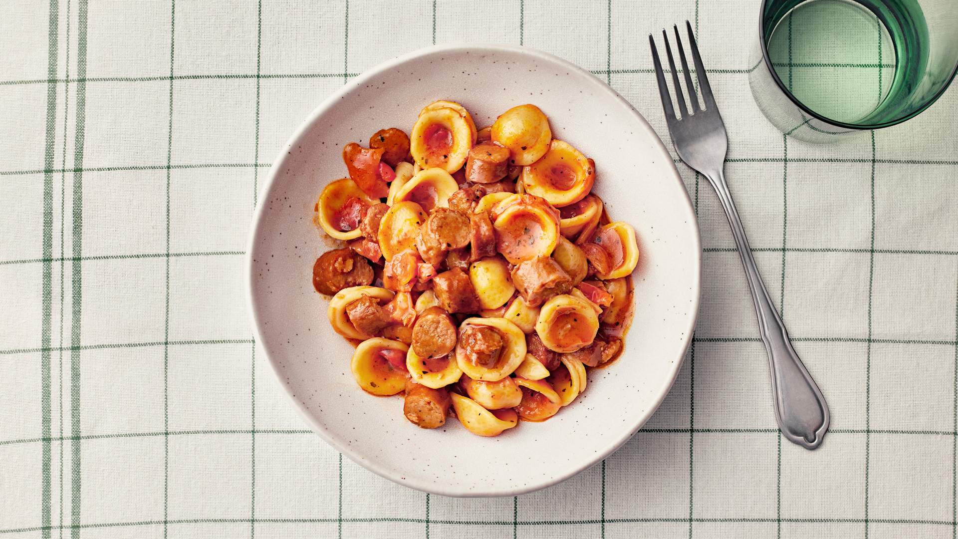Vesi, lihaliemi (vesi, porsaanluu (Suomi), porsaanliha (Suomi), sipuli, suola, mausteet (mustapippuri, maustepippuri, laakerinlehti)), vesi, pasta* (EU) (durumvehnäjauho), Snellmanin chorizomakkara 15 % (porsaanliha sis. silava (Suomi), vesi, naudanliha (Suomi), lampaansuoli, mausteseos (valkosipuli, korianteri, kumina, paprika, chili, mustapippuri), merisuola, sipuli, rapsiöljy), tomaatti, tomaattisose, suomalainen kerma, sokeri, jodioitu suola, valkosipuli, chili, basilika, maisstärkkelys, perunatärkkelys, mustapippuri, auringonkukkaöljy. *Pasta saattaa sisältää pieniä määriä soijaa, sinappia ja lupiinia.